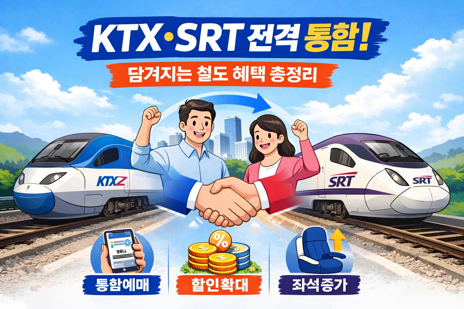 KTX와 SRT 통합은 단순한 제도 개편이 아니라 철도 이용의 편의성 강화와 혜택 확대를 목표로 한 변화입니다. 통합 예매 시스템, 확대된 환승 할인, 좌석 증가 등은 이용자에게 실질적인 이점으로 이어질 것입니다.